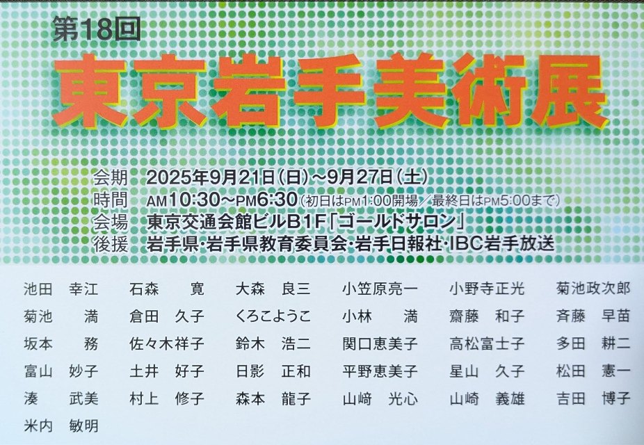 東京岩手美術会(石森 寛代表)は今年4月6日(日)〜4月12日(土)盛岡の「エスポワールいわて」で第17回東京岩手美術展を開催したのに続き、恒例の有楽町・東京交通会館での展示会を開催します。岩手県ゆかりの画家、美術家、支援者の力を結集してのイベントです。ぜひお出かけください