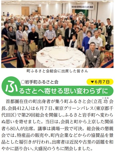 ふるさと会の日程はトップページに記載されています。ふるさと会総会日は岩手県人連合会のホームページを参照ください。岩手町ふるさと会(立花功会長、会員429名)は例年6月開催で、今年は6月7日(土)東京グリーンパレス(東京都千代田区二番町2 TEL 03−5210−4600)の大宴会場「ふじ」で第29回総会を行い、80名が出席しました。 広報いわてまち793に結果報告