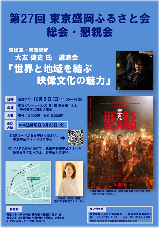 ●東京盛岡ふるさと会(笹田 学会長)総会・・・2025年10月5日(日)11:00〜14:30 麹町東京グリーンパレス